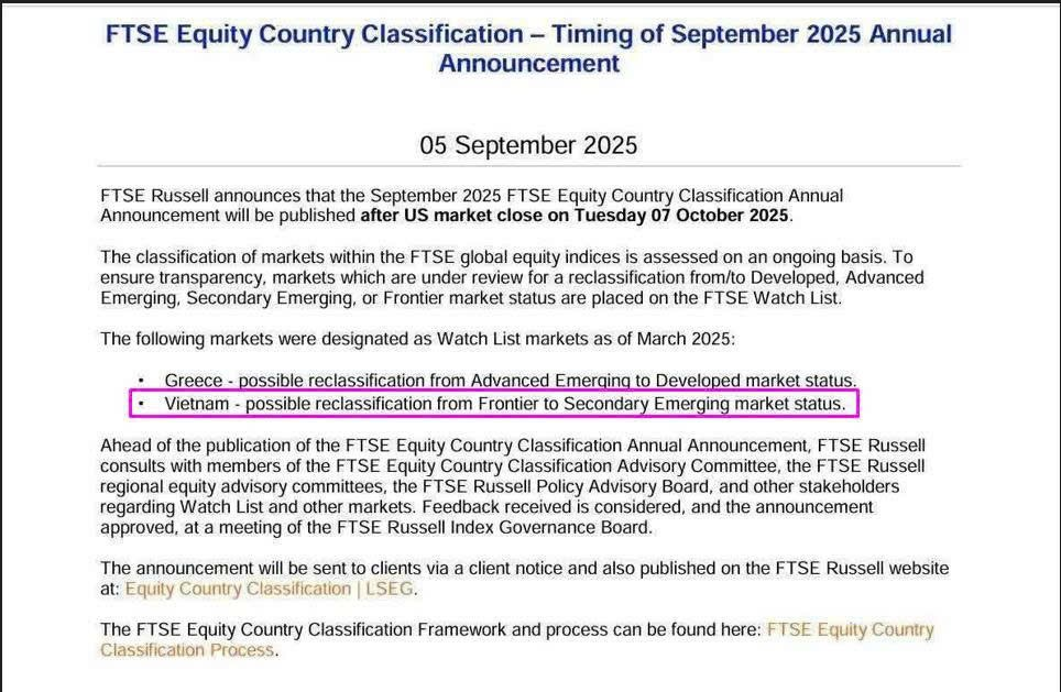 Ngày 5/9/2025, FTSE Russell chính thức thông báo: Báo cáo Phân loại Quốc gia Cổ phiếu (Equity Country Classification Report) kỳ tháng 9/2025 sẽ được công bố sau khi thị trường chứng khoán Mỹ đóng cửa vào ngày 7/10/2025. .