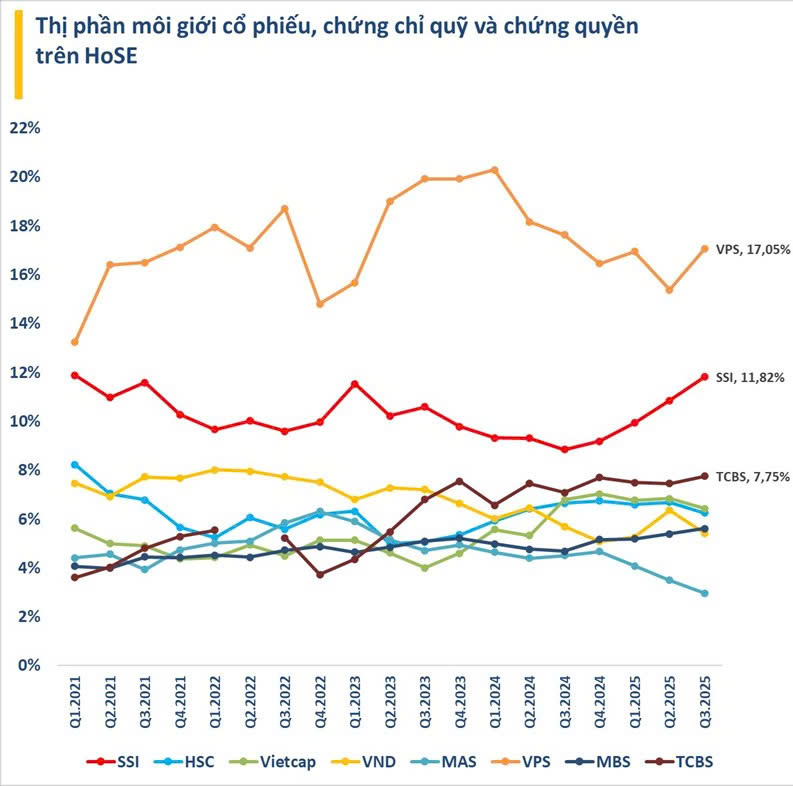 Tại thời điểm Q3/2025, thị phần VPS đạt 17,05%, gấp gần 1,5 lần so với SSI với 11,82%, và gấp 2,2 lần so với TCBS (7,75%).